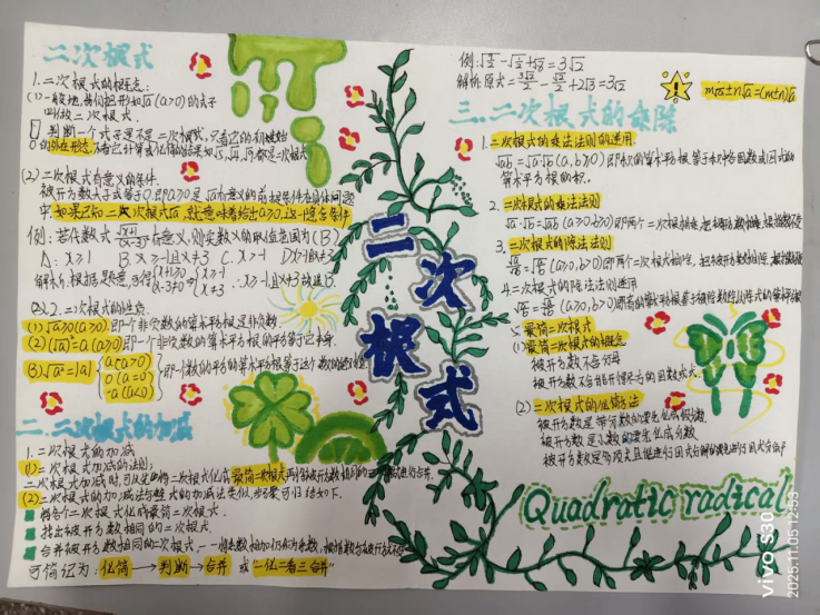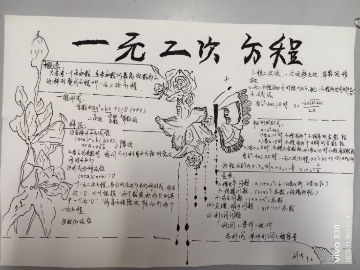 以“一元二次方程”為核心的思維導(dǎo)圖創(chuàng)作大賽,引導(dǎo)學(xué)生跳出單一知識(shí)點(diǎn)的局限,從概念內(nèi)涵、公式推導(dǎo)、題型分類到實(shí)際應(yīng)用,多角度梳理知識(shí)脈絡(luò)。同學(xué)們積極構(gòu)思、巧思設(shè)計(jì),將抽象的數(shù)學(xué)邏輯轉(zhuǎn)化為色彩鮮明、條理清晰的圖形語言。一幅幅優(yōu)秀作品不僅展現(xiàn)了完整的知識(shí)框架,更折射出對(duì)知識(shí)點(diǎn)的深度理解與靈活串聯(lián),讓數(shù)學(xué)思維在筆尖綻放。