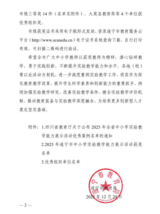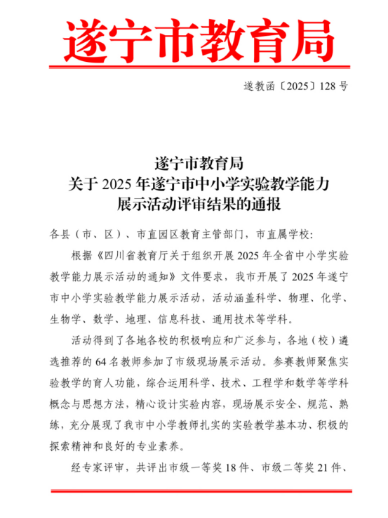 熱烈祝賀楊鳳老師和王蘭老師在2025年遂寧市中小學(xué)實(shí)驗(yàn)教學(xué)能力展示活動(dòng)中喜獲佳績(jī)!